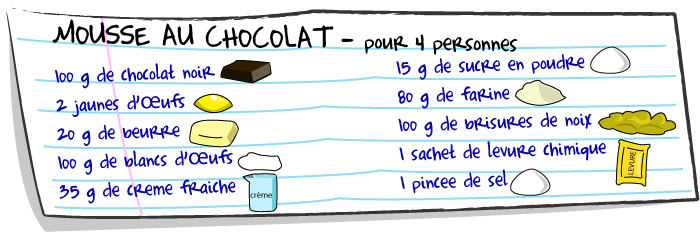 Préparation : 15 minutes - Refroidissement : 2 heures1. Monte les blancs en neige pour obtenir une mousse compacte. Ajoute le sucre tout en continuant de fouetter. 2. Demande à un adulte de faire fondre le chocolat en morceaux avec le beurre. 3. Il faut qu’il verse la préparation dans un saladier. 4. Ensuite, ajoute dans ce saladier la crème puis les jaunes d’œufs. 5. Rajoute encore la préparation des blancs en neige que tu as faite. Mélange le tout. 6. Met le saladier au réfrigérateur. Dans 2 heures, tu peux déguster ta délicieuse mousse au chocolat ! |