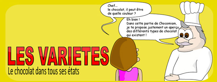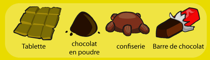 Le chocolat noir :On l’appelle aussi chocolat amer ou chocolat fondant. Il est composé de cacao et de sucre, c’est tout. En France, on appelle chocolat noir un chocolat qui est fait à au moins un tiers de caco. Le chocolat au lait :Comme pour le chocolat noir, on mélange du cacao ainsi que du sucre. Le chocolat blanc :Pour le faire, on utilise pas de cacao pur. On peut trouver ces 3 types de chocolat sous un état solide (tablette de chocolat, confiserie,…) |